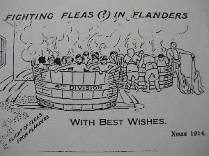 The only specific thing I can remember him talking about was the filth and privations they had to endure and even then it was treated in a lighthearted fashion. He would jokingly refer to it as “Fighting Fleas in Flanders”. I didn’t realise the significance of his humour until I discovered that his Division – the 4th – had produced the postcard below, early in the war, with a cartoon called “Fighting Fleas (?) in Flanders”.